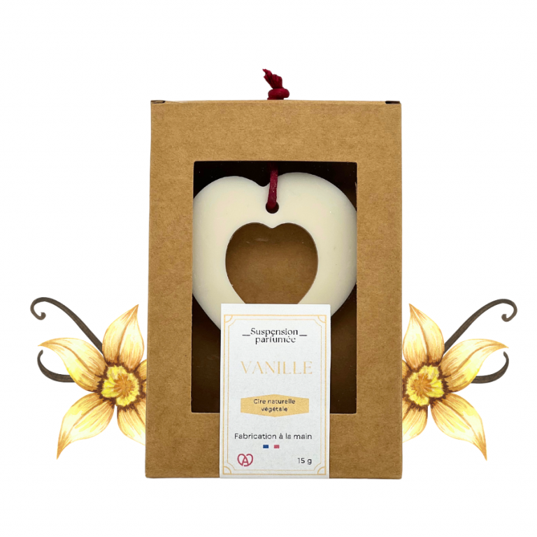 Chaque suspension est fabriquée à la main dans notre atelier en Alsace, à partir de cire végétale naturelle et d’une fragrance de Grasse soigneusement sélectionnée. Ce parfum de vanille, à la fois doux et enveloppant, séduit par ses notes gourmandes, idéales pour les amateurs de senteurs rassurantes et sucrées.